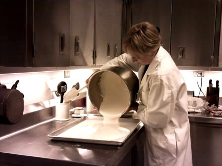 VDC Quality Assurance Program Lab Specialist, Alice Gray prepares cake batter in the industrial Hobart mixer.